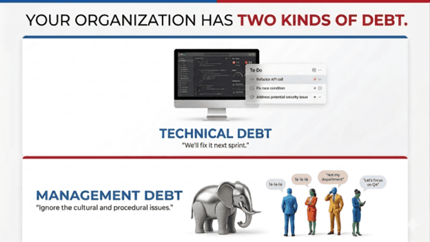 Here's what makes it dangerous: technical debt throws errors. You get a signal. Management debt just makes the whole system feel like it's running through mud — and leaders are often the last to see it because they're the ones who created it.